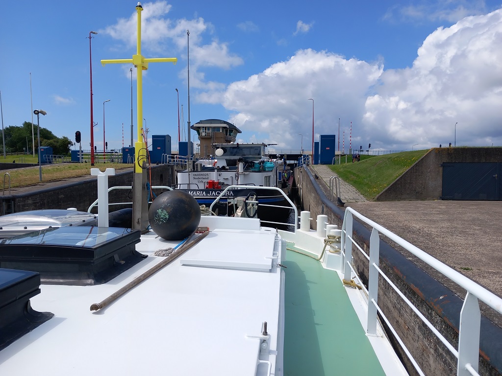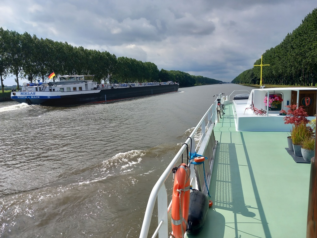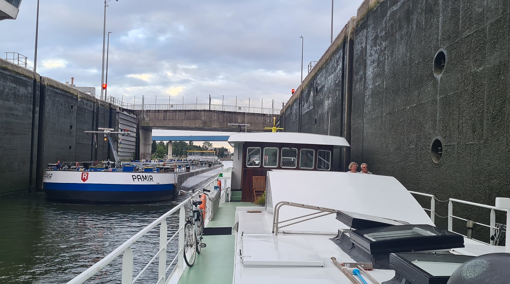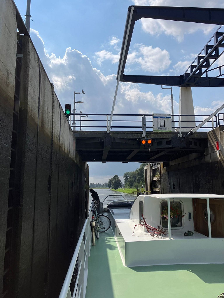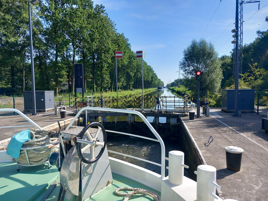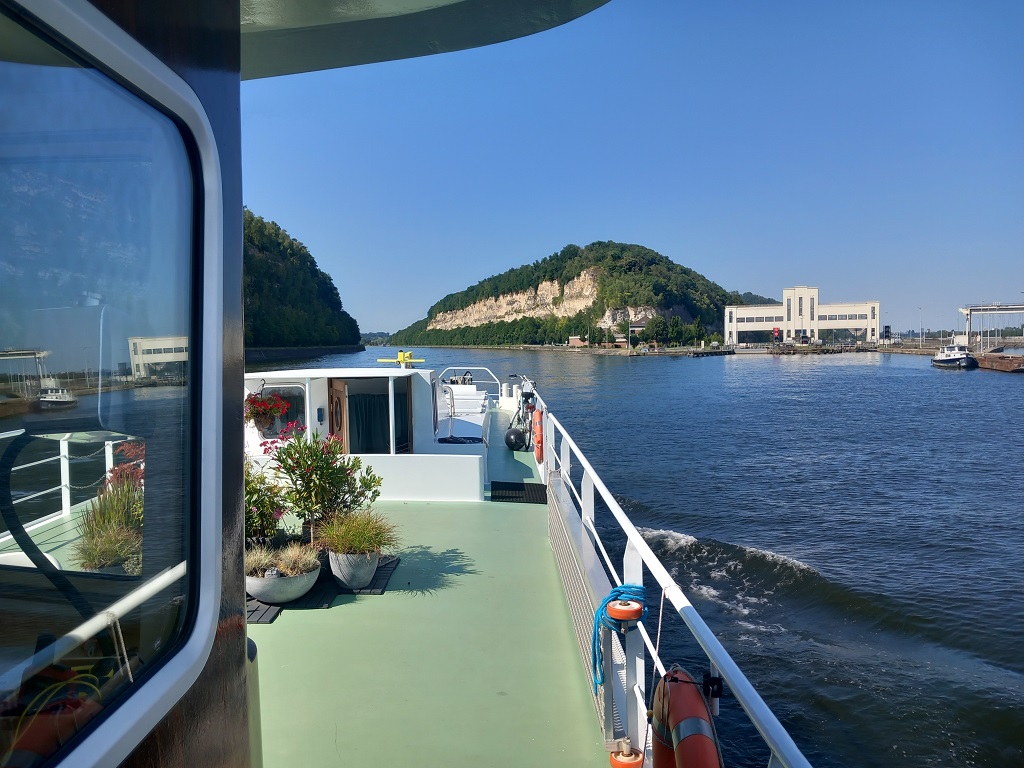 In de krappe sluizen ontwikkelen we na de eerste dag (met 5 sluizen) een goed ritme en aan het eind van de maandag meren we af in St. Job in 't Goor, een slapend dorp aan dit kanaal. Dag 2 gaan we onderweg naar Turnhout. Dit blijkt een levendige stad te zijn met een mega groot Begijnenhof en een echt kasteel. Wat we niet kunnen vinden is een Frietkot en dus eten we aan boord een verantwoordere maaltijd. Dag 3 varen we door een prachtig natuur gebied met bomen en drassige gebieden daar achter. We meren af aan de kade bij Dessel. Daar staat een grote 37 meter hoge uitkijktoren op de kruising van drie kanalen: het kanaal Dessel-Turnhout-Schoten, het kanaal Bocholt-Herentals en het kanaal Dessel-Kwaadmechelen in Witgoor. Dag 4 kiezen we Hasselt als eindbestemming, de grootste centrumstad van de Belgische provincie Limburg. Vanaf hier gaan we verder op het Albertkanaal omdat het alternatief, doorvaren op de toeristische route, onmogelijk is vanwege de beperking in hoogte. Dag 5 begint met de eerste sluis, aanzienlijk groter dan we tot nog toe gewend zijn. We hebben geluk en sluiten aan bij 2 grote vrachtschepen waarmee we de drie sluizen passeren. We zijn vroeg begonnen zodat we al rond twee uur vastmaken aan de Maaskade in Luik. Na mail contact met de havenmeester heeft deze de plek voor ons gereserveerd en we zijn er heel blij mee. De gasten fietsen in de middag door Luik, voor hun de laatste dag aan boord, morgen op de fiets terug naar Groningen. Wij blijven hier het weekend.