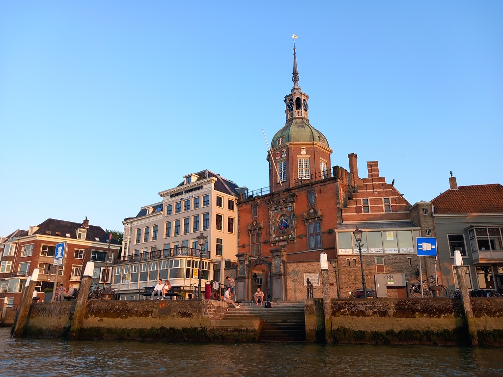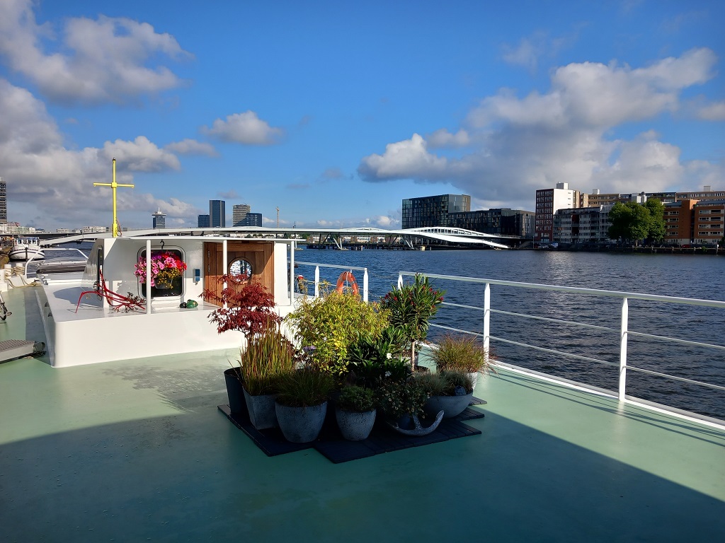 Woensdag 17 juli beginnen we aan de tweede etappe. Via het AmsterdamRijn Kanaal varen we naar Vreeswijk, waar we weer een ligplaats aan de Handelskade vinden. De volgende dag vervolgen we de reis naar Dordrecht. Als we op de Lek varen, stroomafwaarts, moeten we voor het eerst ons blauwe bord gebruiken. Een geladen tegenligger, stroomopwaarts varend, kiest in een bocht om minder stroom tegen te hebben, de binnenbocht . Even een spannend moment maar snel gehandeld en wij eveneens ons blauwe bord met knipperlicht tonend, varen we aan de verkeerde kant van de rivier. We passeren elkaar groen op groen en alles verloopt volgens de regels! In Dordrecht meren we weer af in de Riedijkshaven waar we op vrijdag 19 juli de nieuwe gasten verwelkomen. |