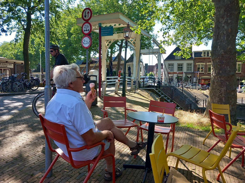 De achste week wordt geen etappe van deze zomerreis. In Dronten wordt een pauze ingelast. We vullen de voorraden aan, krijgen familie op bezoek en doen verf- en andere klussen op de boot. Op de fiets en met de bijboot maken we (kleine) uitstapjes. Volgende week het laatste deel van de reis; terug naar Groningen!