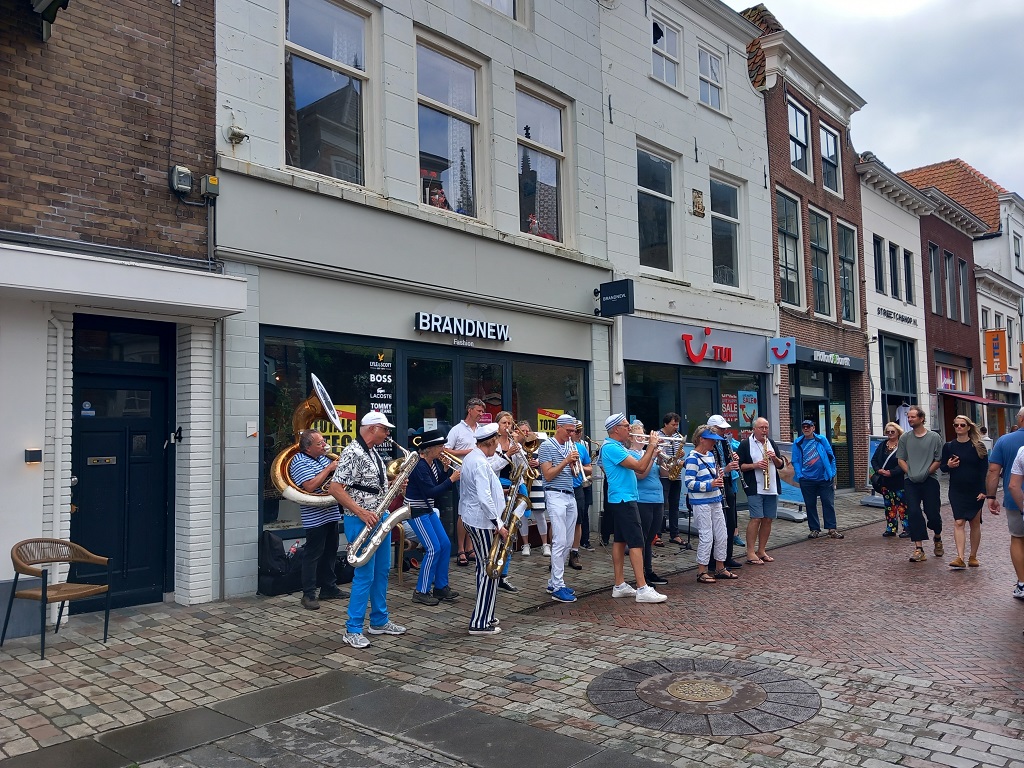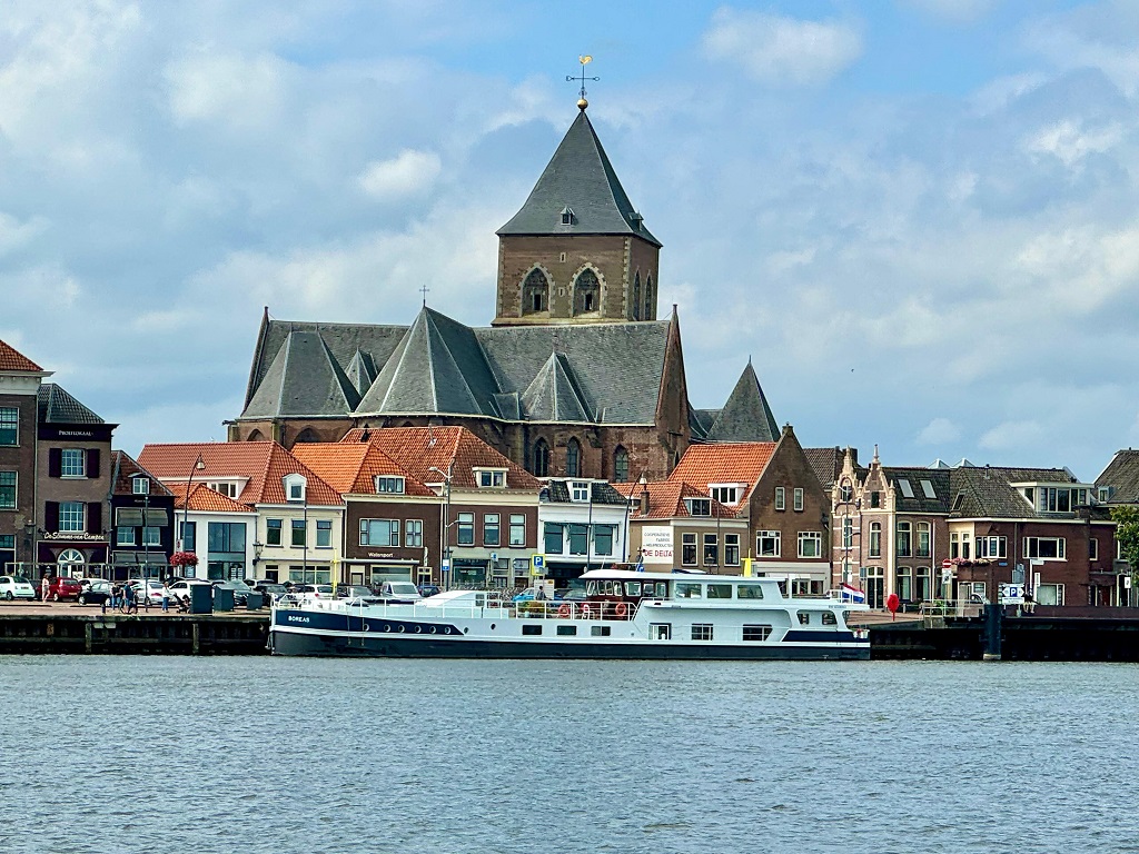 De derde etappe: Op 21 juli vertrekken we richting Bruinisse. We meren af in de vluchthaven want Bruinisse heeft geen plek voor schepen van onze lengte. Hier liggen ook de visserschepen. Een mooi plaatje bij zonsondergang maar als ze 's nachts uitvaren of terugkomen met hun zware motoren op volle kracht zijn we minder enthousiast. Bruinisse zelf is niet bijster interessant maar op fietsafstand ligt Ouwerkerk en het Watersnoodmuseum dat zeer de moeite van bezoeken waard is. De volgende dag varen we naar Goes. We hebben een plek vlakbij het centrum, aan de Houtkaai. We brengen de middag door in Goes. Er is markt, muziek en er zijn tal van leuke winkels zodat we er, ondanks wat regen, een prima tijd hebben. De reis gaat verder naar het Veerse meer en de plek die we ook vorig jaar hadden is ook nu weer vrij. Een steiger bij de opgang naar het strand! We blijven er overnachten en gaan de volgende dag Veere bezoeken. Daar zijn de regels verandert en mogen we niet meer aan de steiger liggen. Ook wel begrijpelijk gezien het grote aantal jachtjes dat daar dagelijks afmeert. De havenmeester tipt ons de plek bij de sluis en dat is dikke prima! Op nog geen tien minuten lopen staan we in Veere en de steiger bij de sluis is een stuk degelijker dan die aan het Veerse meer. Het laatste stukje van deze etappe brengt ons naar Middelburg. Evenals vorig jaar liggen we aan de Loskade, vlakbij het station en het centrum. Zaterdag 27 juli nemen we afscheid van onze gasten. |