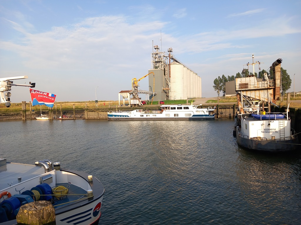 Tegen de tijd dat we de stadhaven van Tiel in willen draaien laten we nog een groot containerschip voorbij varen en dan zo snel mogelijk naar de overkant. De kade is leeg! We meren af en zijn dik tevreden met deze plek. Tiel is een leuke plek om het weekend door te brengen!