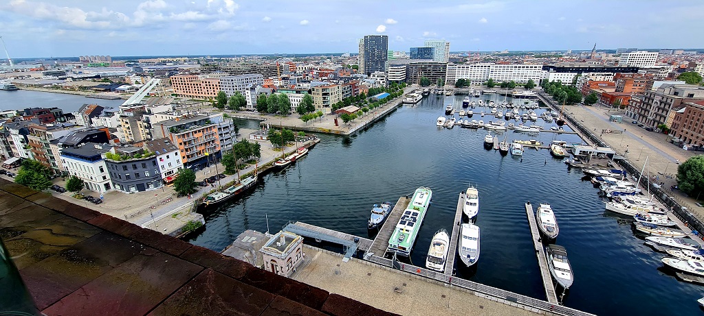 De vierde etappe: Donderdag 1 augustus varen we naar Antwerpen. Als we bij de Kattendijksluis komen moeten we een half uur wachten. We besluiten nog een stukje door te varen om zo de skyline van Antwerpen te gaan zien. Op onze marifoons kanaal 69 (sluis) en 12(verkeer Schelde). Als we een politieboot met blauw zwaailicht op ons af zien komen klink op de marifoon een verontwaardigd: STREMMING, DOORVAART VERBODEN! Blijkt dat we één boei daarvoor hadden moeten schakelen naar kanaal 10. Niets aan de hand. We gaan stil liggen aan de uiterste stuurboordkant en wachten tot een groot passagiersschip onder politiebegeleiding keert en de Westerschelde afvaart. Als we net afgemeerd zijn in de jachthaven Willemdok (hartje Antwerpen) komt de politie aan boord. We krijgen een proces verbaal vanwege het niet uitluisteren van kanaal 10. De loods aan boord van het passagiersschip heeft dit geeist in de veronderstelling dat wij beroepsvaart zijn. De politie ziet aan onze papieren dat we pleziervaart zijn en aan onze kaarten dat het switchen naar kanaal 10 niet of nauwelijks staat aangegeven. Nou ja, in het ergste geval een schikking en hopelijk wordt de zaak geseponeerd. We wachten het af. We gaan Antwerpen verkennen en zetten onze fietsen aan de wal. We bezoeken de Pauluskerk in het Schipperskwartier. In 1968 afgebrand en met hulp van de buurtbewoners (prostitué's en studenten) is de kostbaren inboedel waar onder 3 schilderijen van Rubens, uit de brandende kerk veilig gesteld. We fietsen langs het Havengebouw. Op een bestaande oude brandweerkazerne is een imposante diamantvormige structuur gezet ontworpen door Zaha Hadid (Britse architecte van Irakese afkomst). Onze buren in de haven hebben vanaf het dakterras van het MAS (Museum aan de Stroom) 's avonds een foto van het Willemdok gemaakt. Zoon Jurjen gaat zaterdag 3 augustus van boord. |