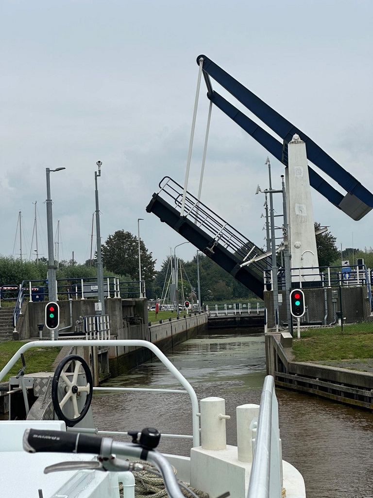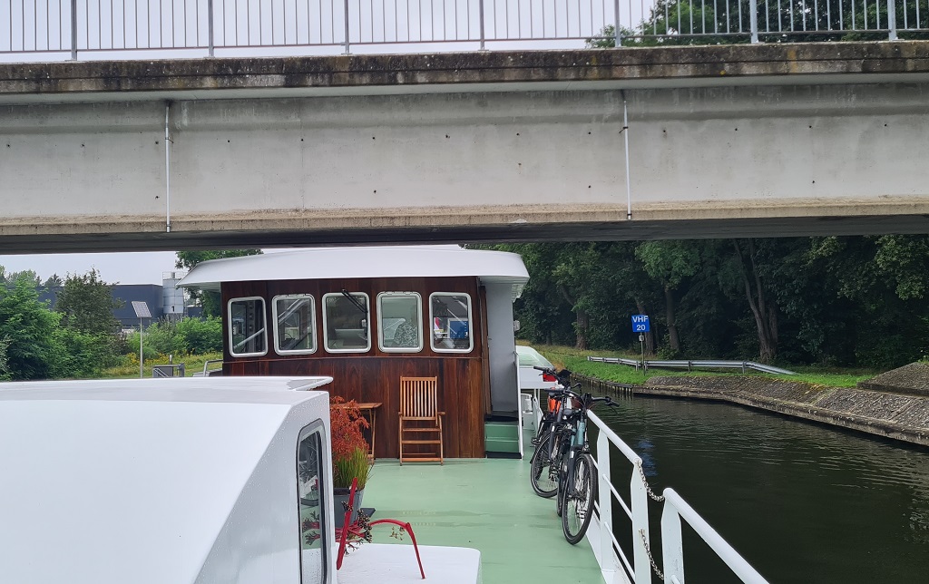 Al gauw blijkt dat niet de hoogte van de bruggen maar de breedte van ons schip een beetje voor stress zorgen. We varen door krappe bruggen met zowel voor als achter iemand die met een walkie talkie de overgebleven afstand schat. We melden: 50 cm, 30 cm, 20 cm, 10, drijfhout!!