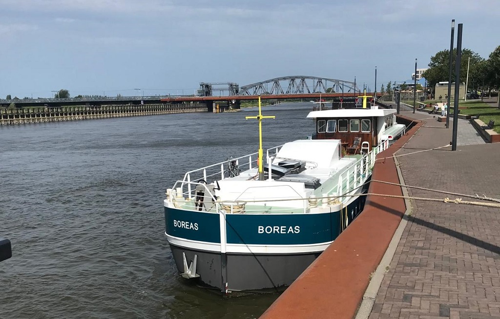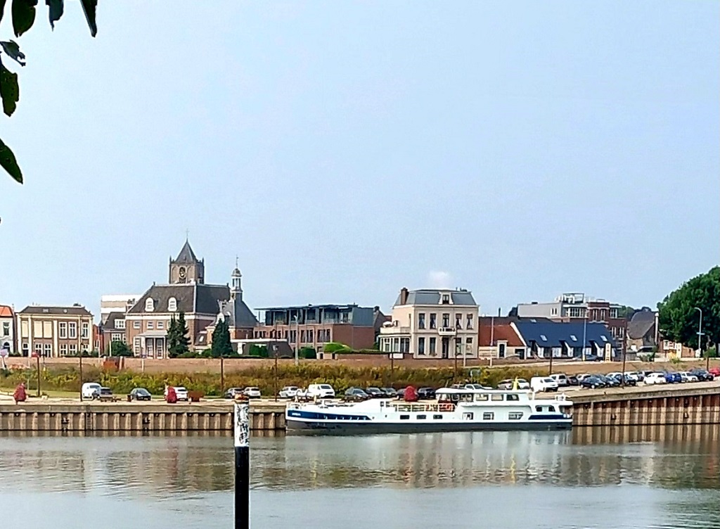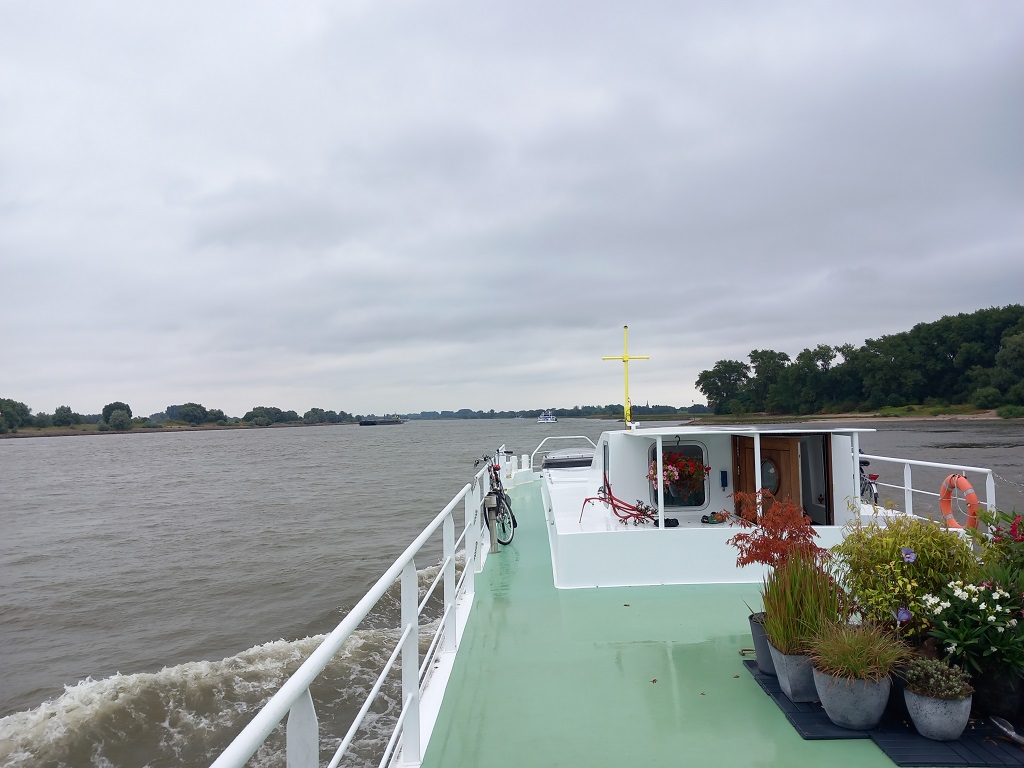 Het is dinsdag 20 augustus als we Tiel achter ons laten. We sliepen 4 nachten aan de kade van dit vriendelijke Gelderse stadje, beroemd om de jamfabriek die in de 19e eeuw hier gevestigd werd en waar Flipje van de Betuwe uit voort kwam. We varen verder de Waal op en passeren Nijmegen waar we van plan waren aan te meren maar waar helaas geen plek voor ons is op dit moment. Het is spannend varen op de Waal. We hebben een dikke 4,5 km stroom tegen en erg grote duwbakcombinaties varen af en aan.