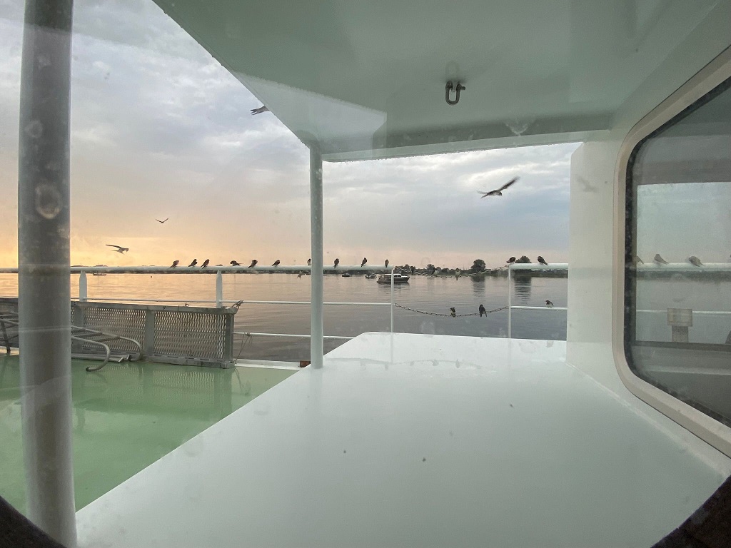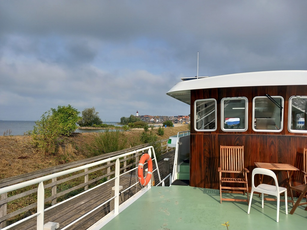 Dinsdag 3 september vertrekken we uit Dronten, de laatste etappe van onze zomerreis! Met weer alles naar beneden kunnen we met onze minimale benodigde hoogte van 4.95m noordwaarts terug naar Ketelhaven. Via het Ketel - en IJselmeer naar Urk waar we eind van de middag aankomen. We krijgen een ligplaats aan de lange plankier. (houten steiger) Vanzelfsprekend eten we verse vis en de dames wagen zich op het strandje en zwemmen in het IJselmeer. Na twee nachten zetten we koers naar Stavoren. Net vóór vertrek spotten we een zwaluwtje in het gangboord; het is waarschijnlijk tegen onze ruit gevlogen. Behoedzaam wordt de zwaluw opgepakt en ogenschijnlijk is het met de schrik vrijgekomen. Liefdevol wordt het op de wal weer op de pootjes gezet en we hopen dat het verder goed gaat!