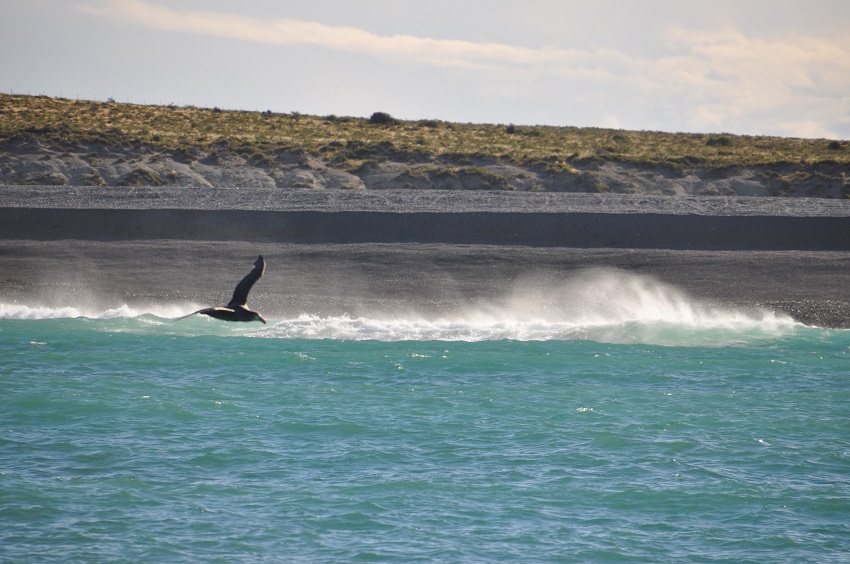 Het is dus maar goed dat we gisteren zijn vertrokken en de eerste 100 mijl zijn al weer stuk. Nog 300 te gaan tot het eiland Valdes. Omdat we zo vroeg zijn, willen we nog een kant bezoeken. Hier is een erg nauwe doorgang, waar 6 mijl stroom kan staan. We moeten het dus zo uitkienen er of met hoog, of met laag water te zijn. Verder hebben we 2 krachtige motoren en die slepen ons er wel doorheen, want het is maar een paar mijl en dan is het weer rustig. We genieten van het varen. Afgelopen nacht weer veel walvisgeluiden. Nu het water kouder wordt, is er veel leven om ons heen.