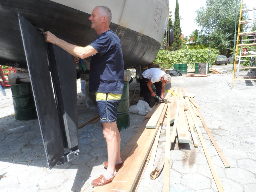 Ondertussen heb ik de beide schroeven gedemonteerd; schoongepoetst met een borstel om verf te verwijderen op de meegebrachte flex en de aangroei vliegt er af. Daarna weer zorgvuldig invetten en monteren. Beide schroeven zien er als nieuw uit. Ook begin ik al vast de waterlijn in de anti fouling te zetten. Dit moet nieuwe aangroei verhinderen en op de waterlijn was de verf er na een aantal schoonmaakbeurten vrijwel af. Deze kwetsbare plekken krijgen zo 2 lagen. De volgende dag vroeg op en het hele onderwaterschip nog eens in zijn geheel in de verf. Mooi zwart staat ze daar nu te wezen en ik heb loodzware armen en een beetje zere schouders van het voortdurend boven de macht werken. Douchen en dan naar de Douane, die niet wil geloven dat ik het af heb. Toch mijn stempeltjes en een nieuw formulier gekregen dat het werk af is en nu kunnen we het water weer in. Stipt om 16.00 komt de werf baas en de kraan en met een beetje respect noemen ze me commodore. Zij hadden ook niet veracht dat wij deze grote klus in 2 dagen zouden kunnen doen.