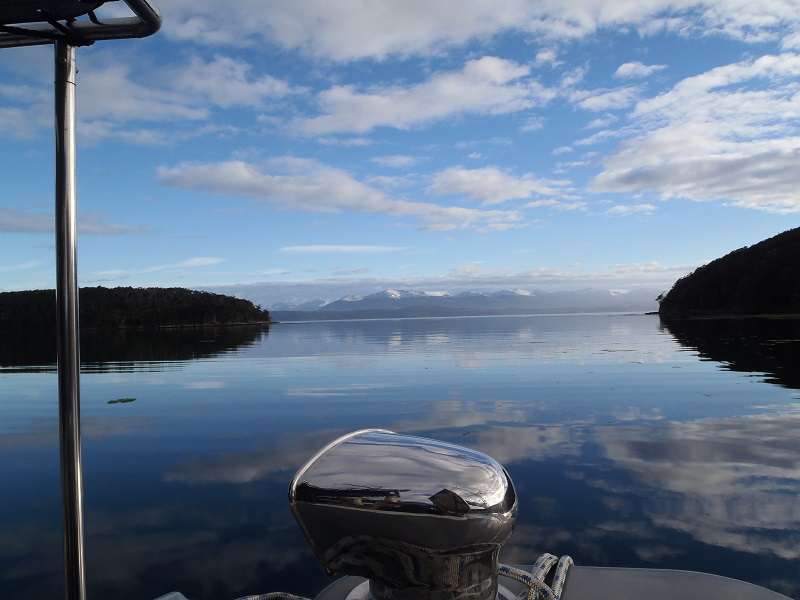 We gaan om 12.00u anker op en hebben aanvankelijk het plan om een klein dorpje op het eiland Navarino te bezoeken. Het zou het meest zuidelijke dorpje zijn en erg vriendelijke bewoners. Onderweg er naar toe verandert de wind weer en wij willen niets liever dan zeilen. We besluiten daarom eerder SB uit te gaan en zeilen inderdaad een half uur. Dan ruimt de wind en weer moet helaas de motor bij. De zeilen kunnen weer naar beneden en we hebben behoorlijk de stroom tegen. Overwegend is hier een oost gaande stroom en dus voor ons pech. Het weer wisselt ook weer snel en vooral de zuidenwind is erg koud. De polaire lucht steekt in ons gezicht en weer lossen we elkaar om het uur af om binnen op te warmen.