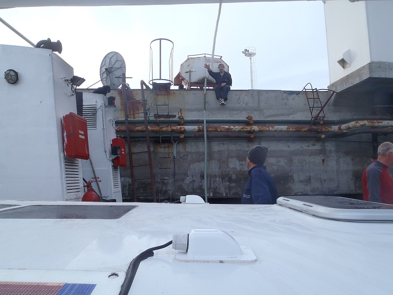 Hij legt verder uit dat het uitgerekend vandaag is dat hij met zijn familie na 365 dagen wordt afgelost. Wij keren terug naar de Necton en ja hoor, daar komt de marine boot aan. Ze blijven ver van ons vandaan en beginnen met het aanvoeren van goederen en diesel en water. Eindeloos varen ze met grote rubberboten heen en weer. Uiteindelijk zien we de man men zijn familie vertrekken en de vrouw huilt. Best wel heftig na een jaar……..