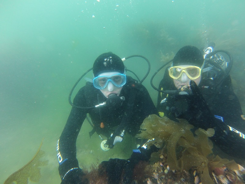 Om ook wat van het landschap te zien, maken we een uitstap als echte toeristen. Als eerste gaan we mee met een duik trip. Er is de mogelijkheid om met zeeleeuwen te zwemmen en het schijnen erg vriendelijke beesten te zijn, die je speels licht in je armen bijten. Als we naar de trip informeren krijgt André ook de geest en wil ook mee. Dat blijkt in het beschermde gebied waar de zeeleeuwen zwemmen niet te kunnen. Om te duiken heb je daar een brevet nodig. Om een nieuwe duiker zijn carriere te laten beginnen, kiezen daarom we voor een duik trip dichtbij waar oude vissen wonen. Het is er niet erg diep en dus de ideale stek om voor het eerst te duiken. Met een bootje varen we naar de plek en ieder krijgen we een begeleider. Na een aarzelend begin gaat het duiken André goed af en met z'n drieën zien we veel kelp, poliepen, mosselen, zeesterren en grote slakken. Ook zien we verscholen onder de rotsen grote vissen die volgens onze buddy's wel 50 jaar oud zijn. De eerste duik van André is een feit!