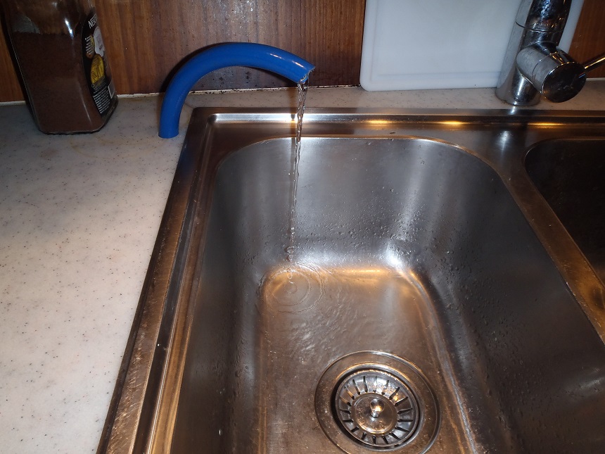 De kuip zit vol met zoutkorsten en met het nieuwe zoete water en een sopje maak ik de instrumenten schoon. Ook de kuipbanken en de tafel zien er weer een stuk toonbaarder uit en het voelt een stuk prettiger als je niet voortdurend je aan zoute stagen vast grijpt.