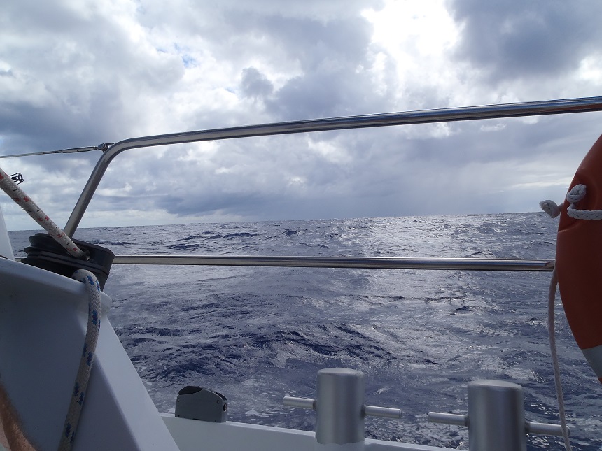 Heel langzaam neemt de harde wind af en draait helaas weer naar het westen. Dat betekent er pal tegen in en daarom maar een motor bij en alleen voor het gereefde grootzeil tegen het slingeren. Af en toe stort de kop zich in een diep dal, maar gelukkig nemen de golven ook langzaam af. Het nieuw opgehaalde weerbericht bevestigd de westenwind. Ook blijft deze nog een hele poos staan en daarom de watermaker aan. Beide motoren moeten draaien om voldoende stroom te hebben. In de ochtend komt de zon door de grauwe bewolking heen en dan ziet de wereld er weer heel anders uit. Begin eerst maar om alles zout vrij te maken. Binnen is er door het steeds heen en weer lopen een beetje een vieze boel geworden en na 2 emmers zwart water blinkt de salon weer. Ondertussen nog een wasje in de machine. Omdat de motoren draaien is er nu warm water en daarom ook zelf nog even onder de douche. Dat voelt een stuk aangenamer. De wind neemt af naar W 3 en wij varen met een 4,5 mijl gangetje redelijk de goede kant op. In de middag om ons heen een soort dol drums. Veel regen op afstand en donkere wolken. Wel weer een poging om te zeilen, maar overtuigend is het niet. Nog 879 mijl te gaan.