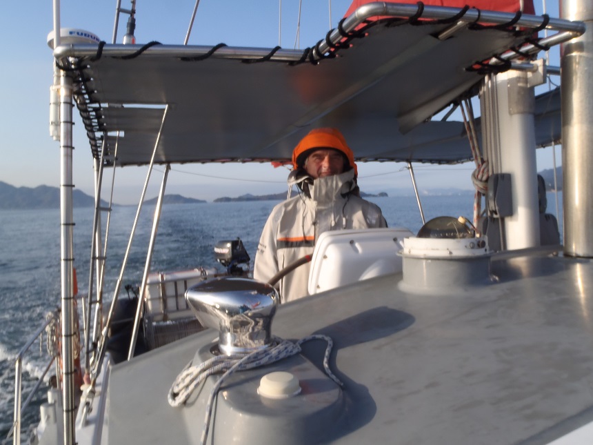 Dan doemt de kust van Japan op. Eerst zien we een kleine actieve vulkaan Ia Tori Shima, die we op een paar mijl passeren. Het is erg heiig en het zicht daardoor beperkt. Dan zien we de eerste vissersboot. Met lange antennes aan boord schiet het snel over de golven. Dan naderen we de steile kusten. De bergen rijzen recht uit het water op en overal is het diep. Ook zien we een grote toename van schepen. We varen de smalle passage van Shimono Seki door waar de stroom maximaal 4 mijl loopt. Het laatste stuk doen we rustig aan om in de ochtend bij daglicht aan te komen. We zien steile bergen waar dorpjes in een vallei liggen. Veel constructies om aardverschuivingen tegen te gaan. Weinig van het land is maar bewoonbaar lijkt het. Op mijn nachtwacht varen we door een stuk waar ik op de AIS maar liefst 63 schepen om mij heen tref. Het oversteken van de vaarroute om BB uit te gaan naar Hiroshima is een hele opgave. Een heel treintje van schepen komt van voren en het is een hele kunst er een gaatje tussen te vinden. Een grote gaat voorbij en dan scherp BB uit en even 1 motor vol gas. Snel laten we het snelverkeer achter ons en varen het laatste stuk naar de baai. Hiroshima ligt in een kom en we zien de zon opkomen. Het land van de rijzende zon is bereikt. Lia en Klaas vliegen naar huis.