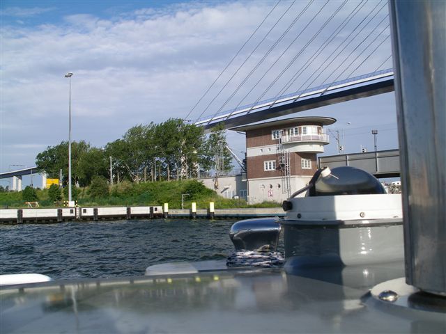draait, er meteen onderdoor kunnen varen. De autobrug is met 24 m hoog genoeg;