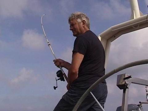 maar rond de middag valt de wind weg. Aldert probeert een visje te vangen (zie