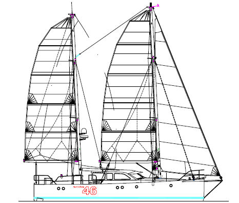 Een schip met een (hydraulisch) ophaalbare kiel en 2 roeren. Om zo veel mogelijk selfsupporting te zijn, komen we uit op 2 motoren; 2 relatief kleine masten en uitwisselbare grootzeilen. Omdat we in Groningen erg gehecht zijn aan onze G.M.C. club, moeten we de maten aan het maximaal haalbare aanpassen. Deze zijn 14 meter lengte en “slechts” 4 meter breed. Het resultaat is een erg snel schip en dat wilden we ook graag.