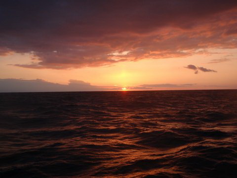Ietwat jaloers kunnen wij alleen maar schuchter terug reageren; zo snel kunnen wij niet.............Langzaam nemen ook de golven in omvang af en we zeilen met een prachtige zonsondergang de nacht in.