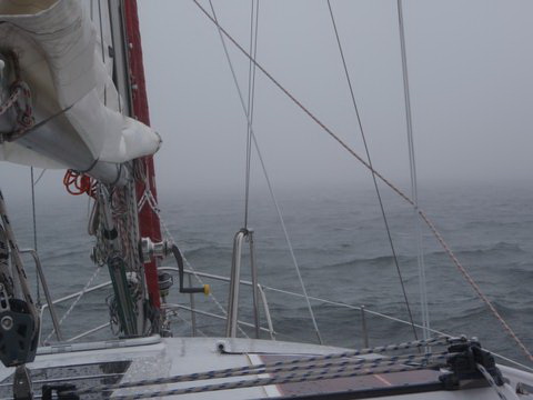 In de avond neemt de wind af en het laatste stukje varen we op de motor en om het tij te halen moet zelfs de 2e motor nog even bij. Het is springtij en de stroom loopt hier tussen de rotsen met ruim 6 knopen; daar wil je liever niet tegenin omdat je dan uren onderweg bent en niets vooruitkomt. We zien de eerste rotsen met vuurtorens uit de mistige wereld om ons heen opdoemen. Het nauw wordt smaller en we stuiven met de laatste stroom mee lang de vele bakens. Nu een foutje maken en je bent je schip kwijt!