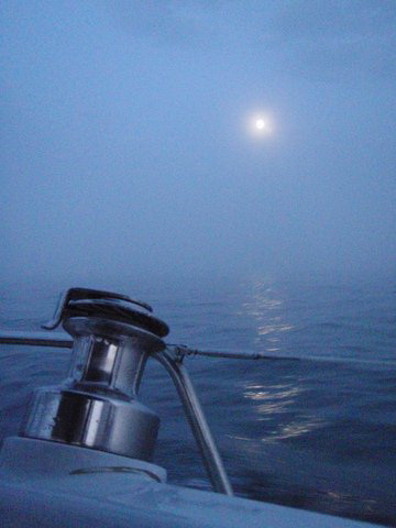 In de nacht neemt de wind af en de volgende ochtend vertrekken we na een uitgebreid ontbijt. Van de weersvoorspelling weten we dat de wind in het ZW zal blijven zitten en dit betekent met de motor er tegenin. Daar wordt niemand blij van en nadat we van de havenautoriteiten gehoord hebben: "you may proceed" stomen we de grote haven uit. Buiten de pieren staat een onrustig zeetje. Hoe verder we naar dieper water komen, hoe rustiger het wordt en we zetten 1 motor op eco-speed. Gelukkig neemt gedurende de dag de wind verder af en de golven navenant. Het zicht wordt steeds beroerder en ons wereldje kleiner en kleiner. Het wordt weer instrumentjes varen en we oriënteren ons op de AIS en de Radar. Veel vissersboten, waar we een enkele keer voor uit moeten wijken. Zo varen we de nacht in, waarbij alles buiten kletsnat is. Het water drupt overal vanaf en het is prettig om af en toe even bij het kacheltje op te warmen. Het is volle maan en die geeft deze vreemde atmosfeer een bijzondere dimensie.