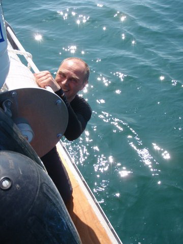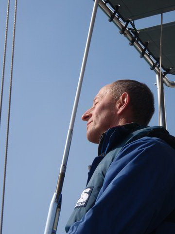 Soms breekt het gele licht door de wolken heen en dan lijken wolken en de grijze zee één geheel. Omdat het zo slecht zicht blijft, is er voortdurend iemand buiten die op zijn beurt koud staat te worden. We verlangen naar warmere wateren. Zijn we vertrokken met zeewater van 3 graden Celsius, in de straat van Dover was deze 4 en nu zitten we op 6. Langzaam kruipen we richting de 10 graden, waardoor het onder in de boot ook niet meer zo snijdend koud is. We motorren de nacht door en in de loop van de ochtend neemt de kracht van de zon toe en gelukkig ook de wind. Gep wordt al weer enthousiast en we hijsen full flaps. Met nog stroom tegen lopen we maar 2.5 knoop en de schipper aarzelt. Verspelen we zo niet het tij bij Guernsey? Neptunus leest de gedachten en blaast een beetje bij. We lopen nu 4 knopen en met het draaien van het tij gaan we het daar me halen. Anna wordt helemaal blij van het geluid van de golven en eindelijk geen brom meer in de oren. De zon breekt verder door; Jan van Genten scheren over het water op zoek naar voedsel. We halen de kussens tevoorschijn en zitten in de zon. We zeilen en genieten!